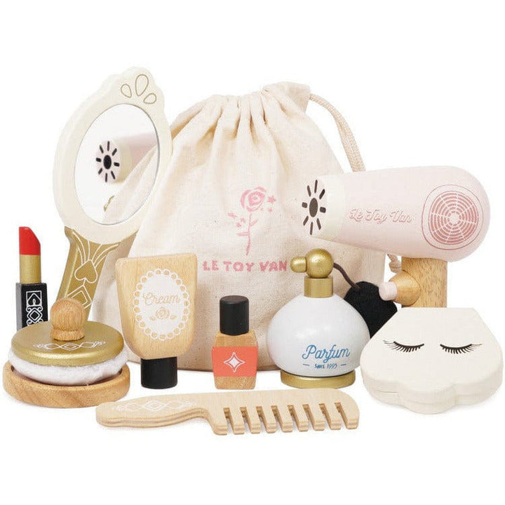 Be a star! Inside the cosmetics bag you'll find an assortment of wooden accessories including a vintage perfume bottle with a bulb atomiser, a hand held mirror, a hair dryer, a comb, a shell compact make up kit, a lotion, a nail varnish, a lipstick and a powder puff. Made from sustainable rubberwood, gold paint finish