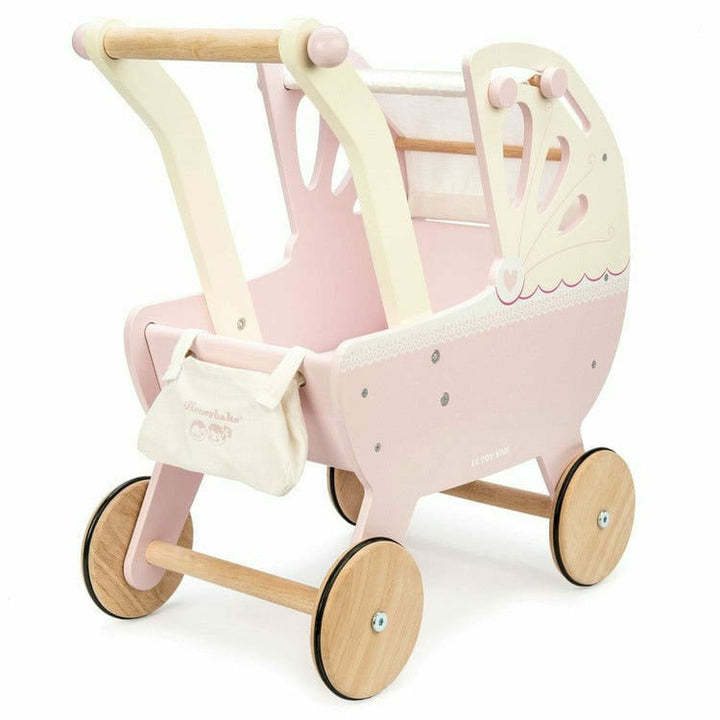 The sweet dreams pram has been designed in a classic traditional & aesthetic style with pretty, delicate detailing. Featuring soft pastel pink, cream and fresh white colours with heart and lace motifs. Its strong structure and unique retractable hand-seen canopy makes it the perfect pram to take soft toys and dolls