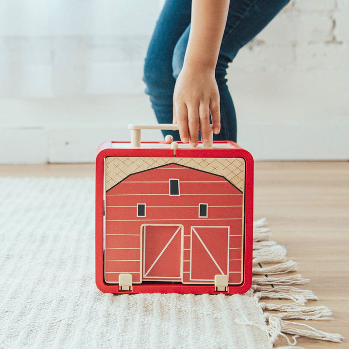 Your kiddos will love our Take with Me Farm. It comes with 13 wooden pieces including animals, farmers, vehicles, bales of hay, a fence and much more. But the best part is kids can pack up all the pieces into the carry along barn (with functioning door) and go anywhere. Perfect for car rides, plane rides, or just
