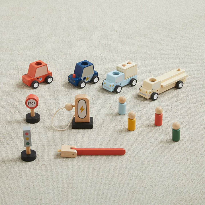 Your kiddos will love our Take with Me Garage.  It comes with 12 wooden pieces including cars, trucks, peg people, ramps, signs, charging station and much more. But the best part is kids can pack up all the pieces into the carry along garage and go anywhere.  Perfect for car rides, plane rides, or just quiet imaginary