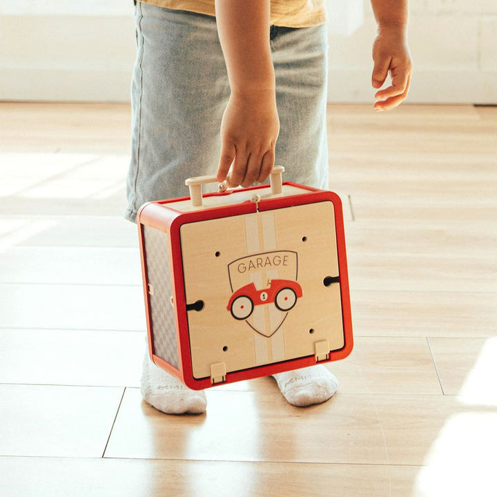 Your kiddos will love our Take with Me Garage. It comes with 12 wooden pieces including cars, trucks, peg people, ramps, signs, charging station and much more. But the best part is kids can pack up all the pieces into the carry along garage and go anywhere. Perfect for car rides, plane rides, or just quiet imaginary