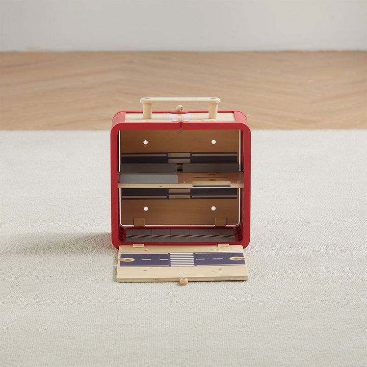 Your kiddos will love our Take with Me Garage. It comes with 12 wooden pieces including cars, trucks, peg people, ramps, signs, charging station and much more. But the best part is kids can pack up all the pieces into the carry along garage and go anywhere. Perfect for car rides, plane rides, or just quiet imaginary