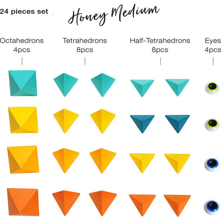 Explore the colors of honey and nature in this 24 piece set which includes 4 octahedrons, 8 tetrahedrons, 8 half-tetrahedrons, 4 eyes (in total 24 pieces) + Leaflet. The 24-Piece Set is a medium building set that allows for more characters and objects. Ages 3Y+ Materials: ABS PP magnetite Care instructions: Wipe with d