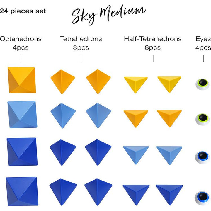 See all the shades of the sky in this 24 piece set which includes 4 octahedrons, 8 tetrahedrons, 8 half-tetrahedrons, 4 eyes (in total 24 pieces) + Leaflet. The 24-Piece Set is a medium building set that allows for more characters and objects. Ages 3Y+ Materials: ABS PP magnetite Care instructions: Wipe with damp cloth