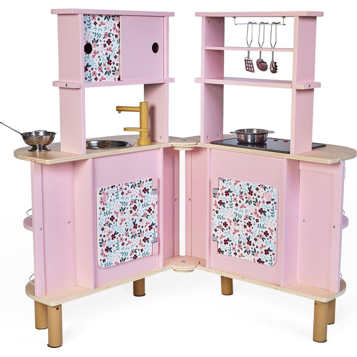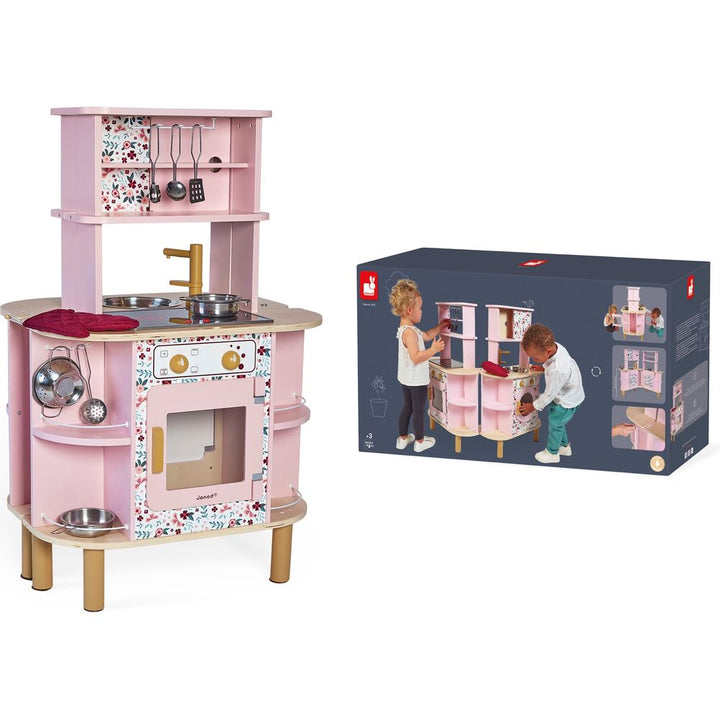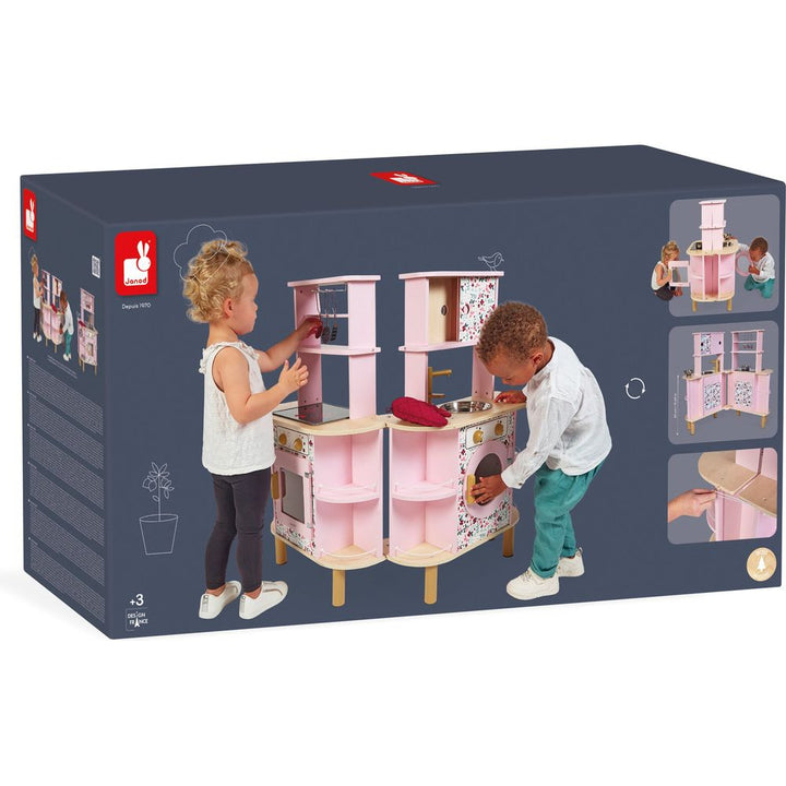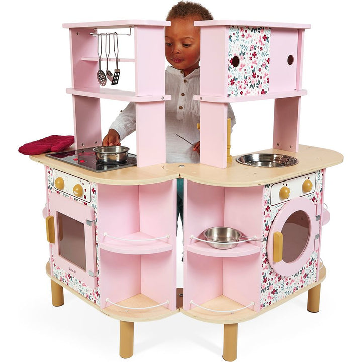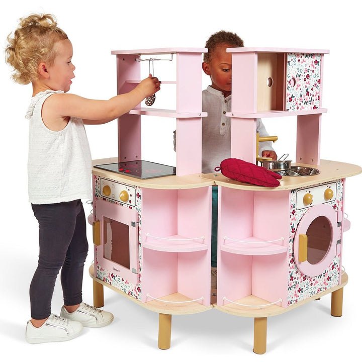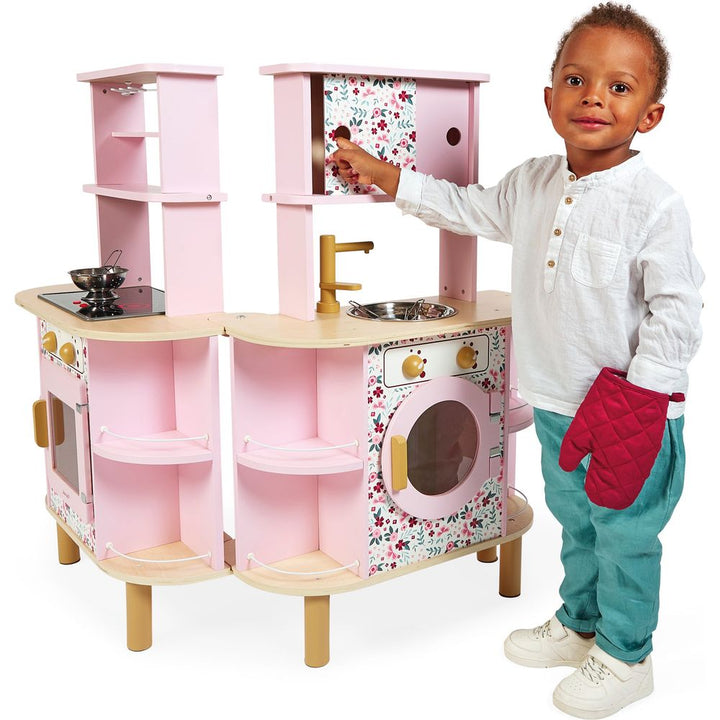 An unfolding double-sided kitchen with a twist! Ideal for preparing delicious meals for several people: this gorgeous wooden kitchen boasts sweet colours and will delight all budding cooks with its many surprises! Need a little more space in the kitchen? We’ve got you sorted… open up the central section to discover w