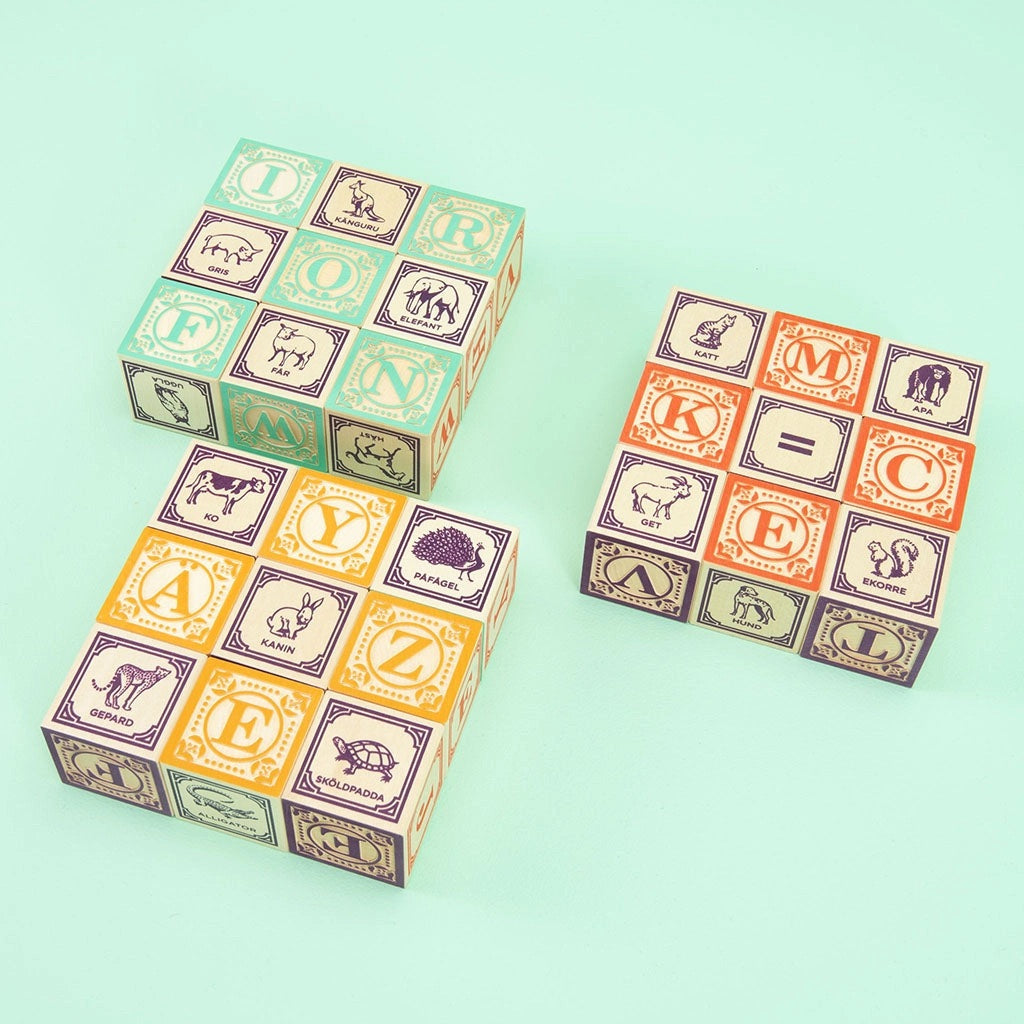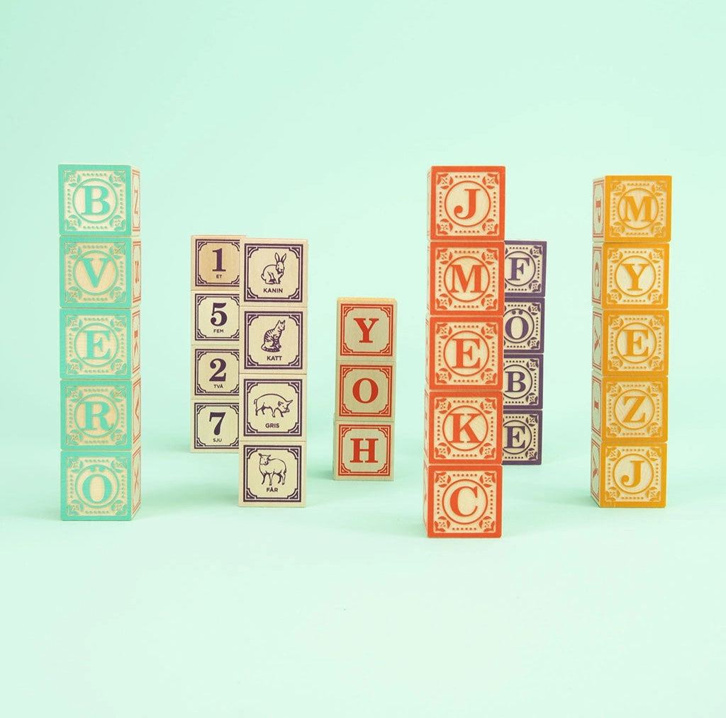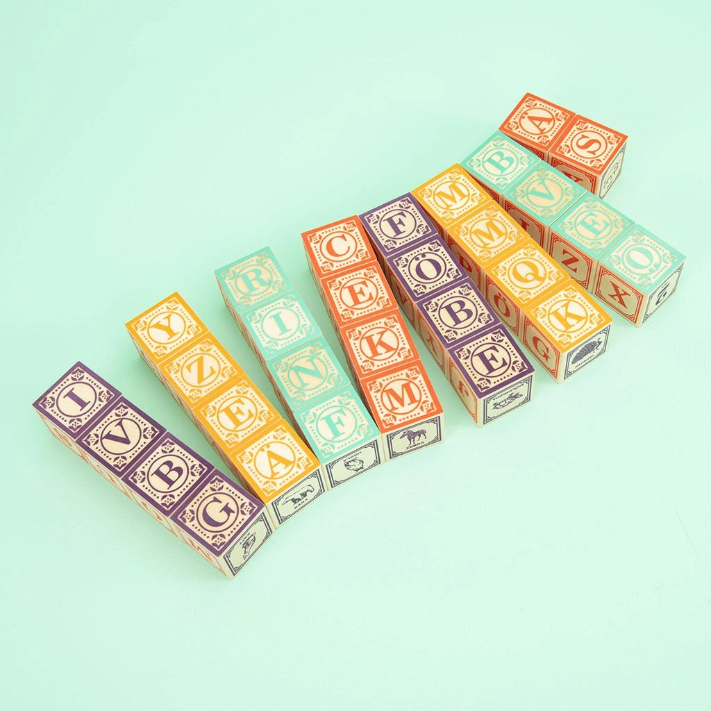 We printed our debonair Uncle Goose logo on a rugged. eco-friendly canvas bag. The Velcro closure makes an oh-so satisfying ripping noise when opened. Designed with ease-of-transport. tidiness. and beauty in mind. Inside the bag. find 28 classic ABC blocks featuring four full alphabets. Add colorful numbers. math symbols. and a menagerie of hand-crafted animals. * 28 – 1.75 inch cubes * Made using sustainable Midwestern basswood * Printed with safe-to-touch inks * 100% made in the USA * Ages 2+