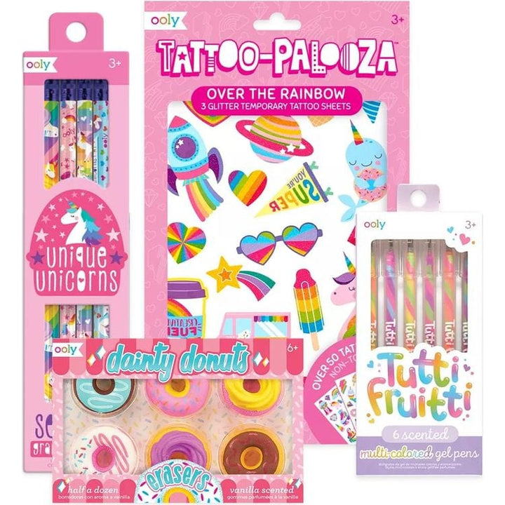 Fill your pages with everything fun and fruity and cool and creative with the Very Beary Sweet Happy Pack! You’ll get a grand collection of fruity scented stickers to match with the Tutti Frutti Scented Gel Pens as well as the Unique Unicorns  Graphite Pencils, Dainty Donuts Scented Erasers  and now Over the Rainbow Ta