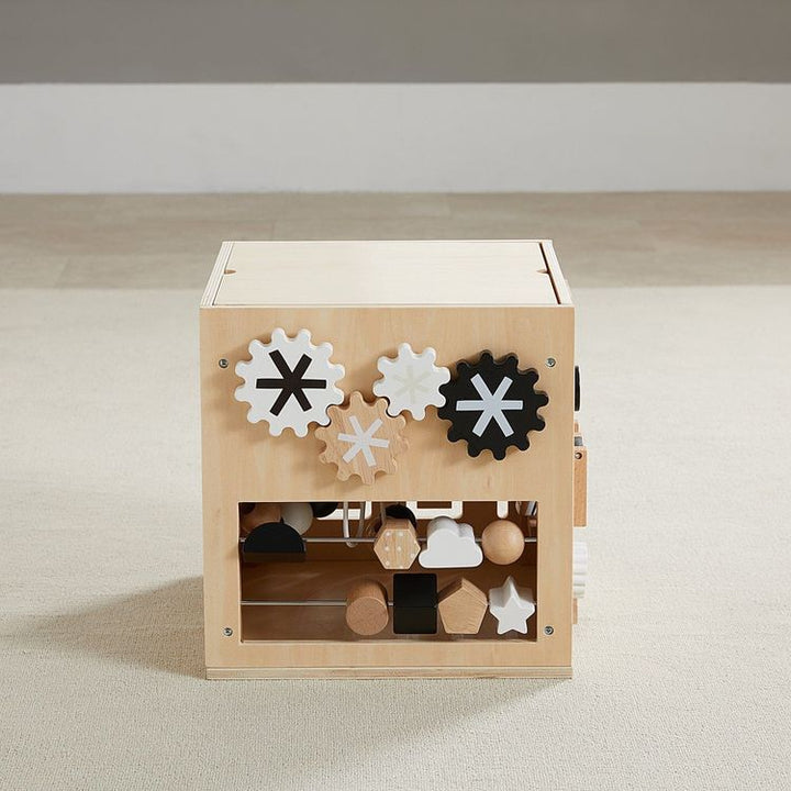 Time to start thinking outside the box with our Busy Box for babies. Baby will be busy sorting 12 shapes on one panel, playing with shapes abacus and gears on another panel, scooting vehicles across a track on a different panel, and lots of activities on the last panel. Add a beaded maze on the top to complete this s