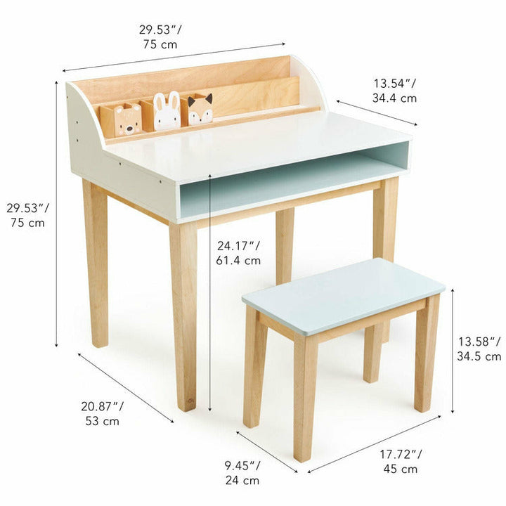 A plywood and rubberwood desk and chair for children that can be placed in a bedroom or nursery is suitable for art and craft activities or homework. Includes 3 handy little wooden pen pots designed to match up with our animal chairs. Material: Wood, Metal Clean with warm towel. Do not use cleaning solution. Keep away
