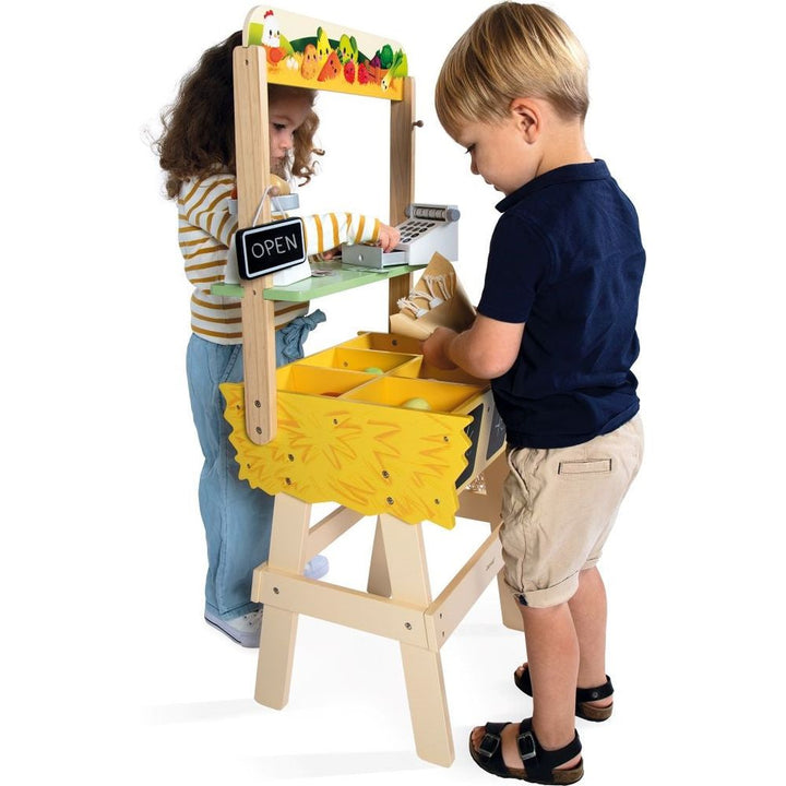 The small producers' market is open! Our wooden Farm Market is the ideal toy for children aged 3 years and up who’ll love pretending to run their own business. This beautiful pretend play toy is equipped with numerous accessories for an enriching and realistic play experience. A total of 58 accessories complete this ch