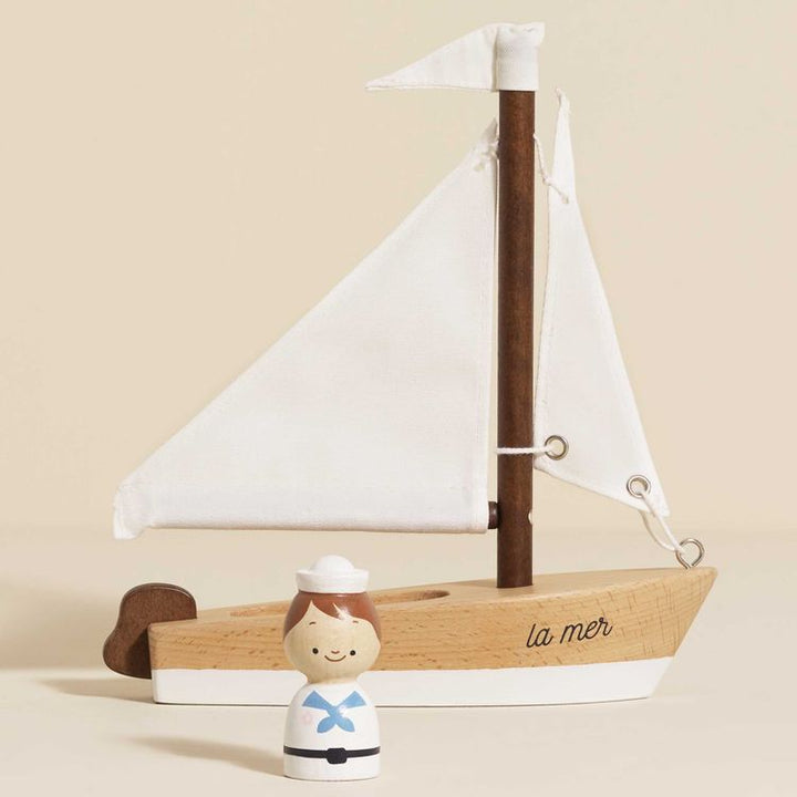 Our sailing boat is a nautical gem, handcrafted to perfection. Full of timeless charm, the additional cotton flag and sails gracefully billow with the wind and propel the boat to boundless horizons, adding to the imaginative play value of this toy. To accompany the boat is a miniature turned wood sailor, with painted s